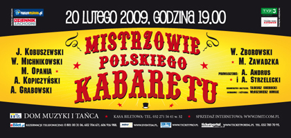 20 lutego o godz. 19.00 na scenie Domu Muzyki i Tańca spotkali się znani i lubiani artyści. Byli wśród nich aktorzy, którzy zapisali się na stałe w historii polskiego kabaretu: Jan Kobuszewski, Wiesław Gołas, Wiesław Michnikowski oraz Magda Zawadzka. Dobry humor zapewniały również występy: Andrzeja Grabowskiego, Andrzeja Kopiczyńskiego i Włodzimierza Nowaka. Publiczność bawili także:
