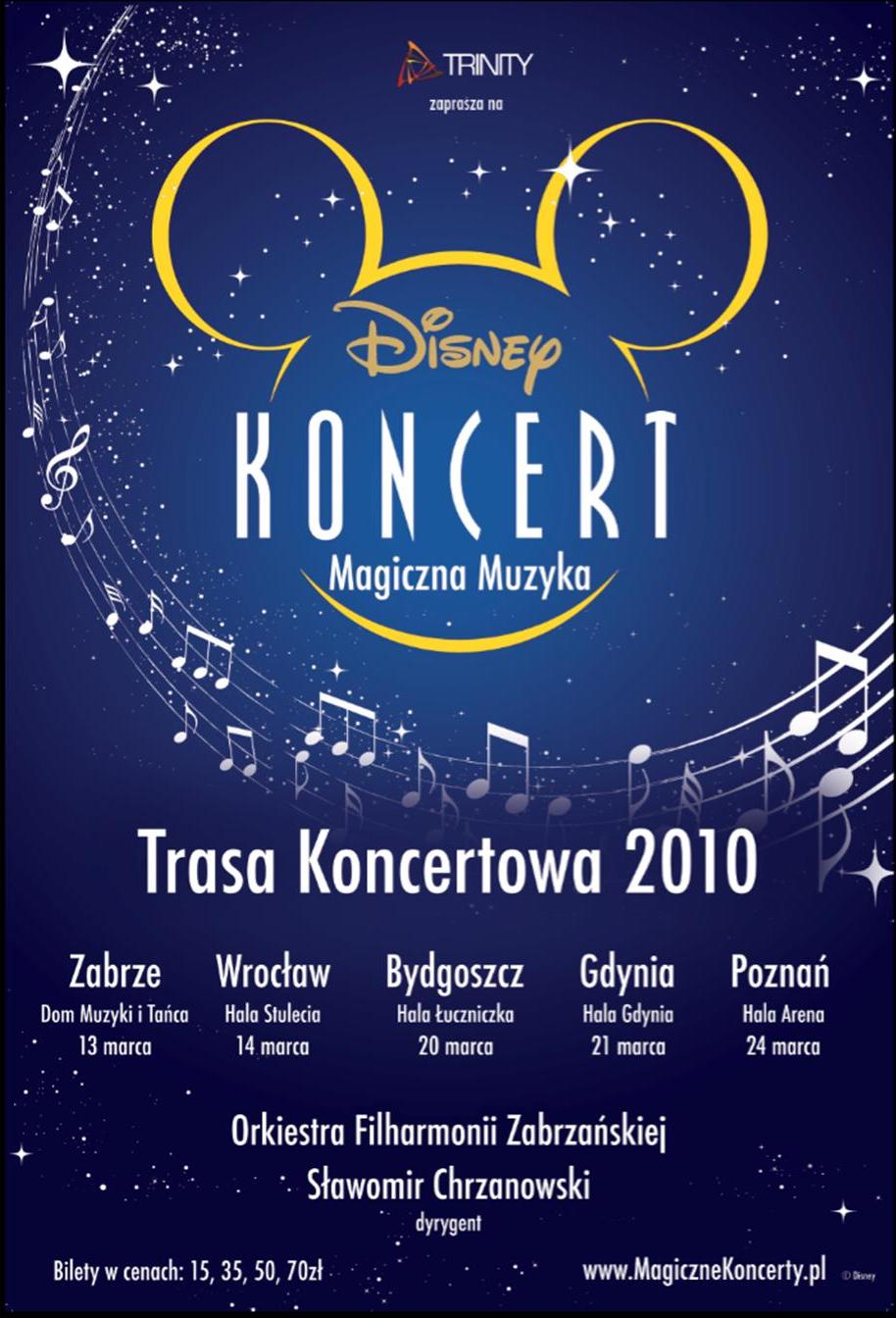 Koncert „Magicznej Muzyki” Disneya to niezapomniane przeżycie zarówno dla dzieci, jak i ich rodziców. Przy dźwiękach najpiękniejszych filmowych melodii widzowie wyruszą w podróż dookoła świata na spotkanie z bohaterami takich filmów, jak „Aladyn”, „Piękna i Bestia”, „Mała Syrenka”, czy „Król Lew”. Na koncert złoży się osiem suit skomponowanych specjalnie do filmów Disneya m.in. przez Alana Menkena, Bruce’a Broughtona i Jerry’ego Goldsmitha.