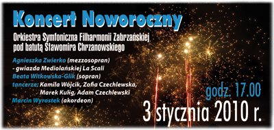 Tradycyjnie już styczniowe imprezy w Domu Muzyki i Tańca zainaugurował koncert noworoczny. Tym razem był to występ Orkiestry Symfonicznej Filharmonii Zabrzańskiej pod dyrekcją Sławomira Chrzanowskiego, która towarzyszyła znakomitym wokalistom - Agnieszce Zwierko, Beacie Witkowskiej-Glik i Rafałowi Bartmińskiemu. Popisom wokalnym towarzyszyły występy tancerzy Zespołu Pieśni i Tańca „Śląsk” – Kamili Wójcik, Zofii Czechlewskiej, Marka Kuliga i Adama Czechlewskiego. Gościnnie wystąpił Marcin Wyrostek zwycięzca drugiej edycji programu "Mam Talent".