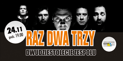 24 listopada o godz. 19.00 na scenie Domu Muzyki i Tańca wystąpi zespół Raz Dwa Trzy. Obchodzący w tym roku 20 -lecie muzycznej działalności zielonogórski zespół został założony przez studentów Wyższej Szkoły Pedagogicznej: Adama Nowaka, Grzegorza Szwałka, Jacka Olejarza i Jacka Ograbka. Drogą do ogólnopolskiej kariery muzycznej grupy było zwycięstwo podczas 26 Studenckiego Festiwalu Piosenki w Krakowie. Na pierwszej płycie „Jestem Polakiem”, wydanej w 1991 roku znalazły się między innymi takie utwory jak: „Każdy ma tyle”, „Ona idzie”. W 1992 roku zespół wystąpił na festiwalu w Jarocinie, a kolejna płyta „To ja” otrzymała pozytywne recenzje. Grupa znana jest z m.in. z utworów: „Ja doczekam”, „Nikt nikogo”, „Żyjemy w kraju”, „Pod niebem”. Ogromne uznanie publiczności zdobył również album z piosenkami Agnieszki Osieckiej „Czy te oczy mogą kłamać”, płyta „Trudno nie wierzyć w nic” a także wydany w 2007 roku album „Młynarski” z twórczością Wojciecha Młynarskiego. Zwieńczeniem dwudziestoletniej działalności zespołu będzie wydanie w listopadzie albumu zawierającego największe przeboje Raz Dwa Trzy. Te niezapomniane utwory w ciekawych aranżacjach będzie można również usłyszeć podczas listopadowego koncertu w Domu Muzyki i Tańca.