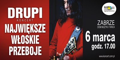 Na ten koncert zapraszamy przede wszystkim miłośników piosenki włoskiej. Gwiazdą wieczoru będzie Drupi, a w jego repertuarze znajdą się głównie piosenki o miłości. Drupi (właściwie Giampiero Anelli) urodził się 10 sierpnia 1947 w Pavii. W latach 60. XX wieku występował z rockową formacją The Magnets, a karierę solową rozpoczął na początku lat 70. Na festiwalu w San Remo, w 1973 roku, gościł z utworem Vado Via, który przez blisko trzy miesiące utrzymał się na brytyjskiej liście przebojów. Innymi przebojami Drupiego były: Piccola e fragile, Tornero, Bella Bellissima. Pod koniec lat 70. cieszył się bardzo dużą popularnością w Polsce, której szczyt przypadł na 1978 rok, kiedy wystąpił na festiwalu w Sopocie z przebojem Sereno é.