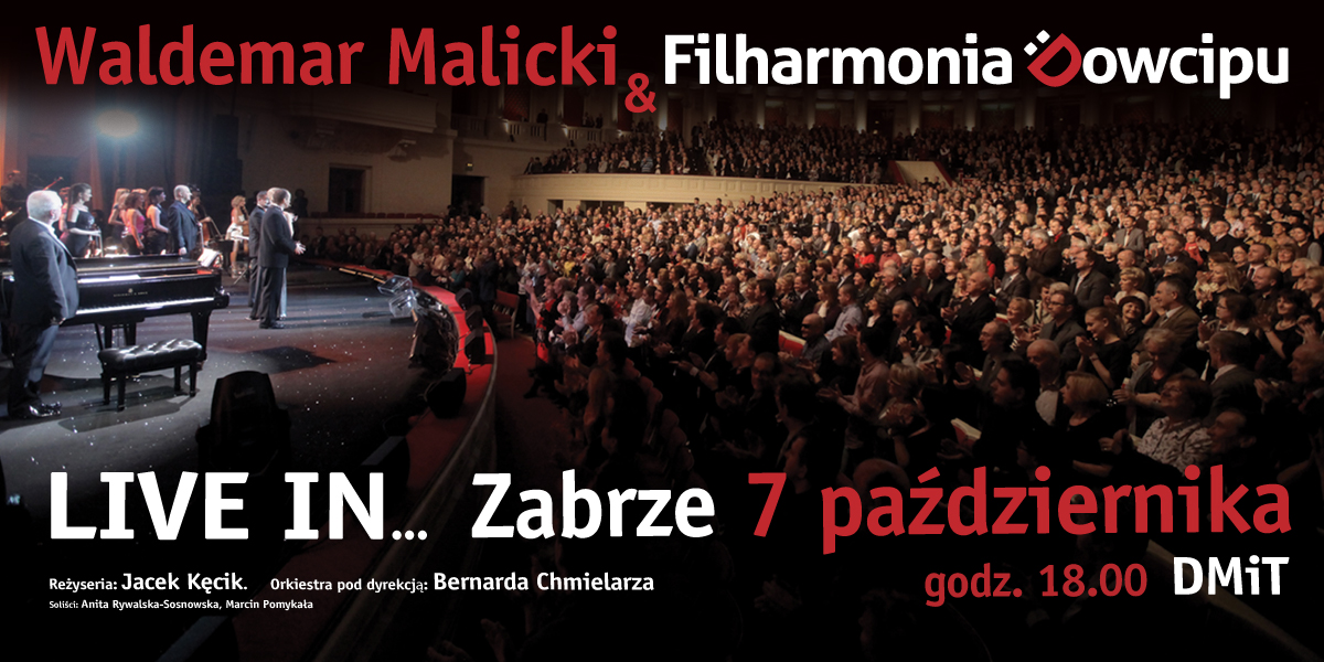 Live In... to ponaddwugodzinne widowisko muzyczne pełne porywającej muzyki, doskonałego humoru, zaskakujących zwrotów akcji, perfekcyjnej gry świateł i znakomitego dźwięku. Spektakl uważany przez widzów i krytyków za prawdopodobnie najlepsze widowisko muzyczne w Polsce. Po niezwykłym koncercie w Domu Muzyki i Tańca w marcu 2012, zaskoczeni, zbudowani i poniesieni pozytywną emocją publiczności śląskiej twórcy Filharmonii Dowcipu postanowili tu wrócić. Live In... to widowisko, którego jedyny spektakl odbył się w wypełnionej po brzegi Sali Kongresowej w Warszawie. Powstałe z niego DVD przebojem wdarło się na listy TOP sprzedaży. Teraz autorzy zamierzają je zagrać na deskach teatrów, filharmonii i amfiteatrów w całej Polsce i razem z polską publicznością stworzyć wydarzenie, które na długo zapadnie w pamięć i widzom, i artystom. Znakomita muzyka, wyśmienity humor, adrenalina do potęgi, perfekcyjny dźwięk, oszałamiająca zgrana z muzyką gra świateł tworzą widowisko. Tu nie ma ściemy. Wszystko jest naprawdę, na żywo i dzieje się na oczach Widzów. Po koncercie twórcy i soliści spotkają się z Publicznością prywatnie – jeżeli będzie na to miała ochotę – podpiszą swoje płyty, porozmawiają, wymienią się opiniami. Do zobaczenia.
