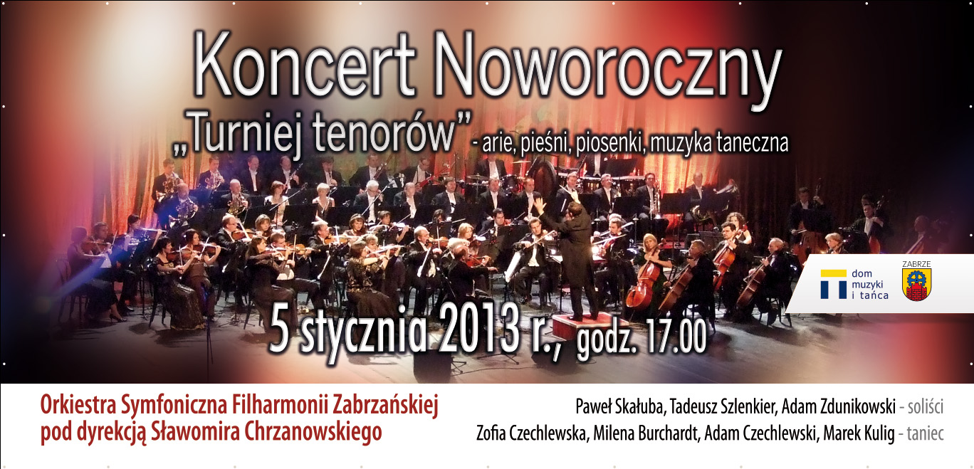 Tradycyjnie już na początku roku na noworoczny koncert zaprasza Orkiestra Symfoniczna Filharmonii Zabrzańskiej pod dyrekcją Sławomira Chrzanowskiego. Tym razem filharmonicy akompaniować będą trzem tenorom - Pawłowi Skałubie, Tadeuszowi Szlenkierowi oraz Adamowi Zdunikowskiemu. W ich wykonaniu usłyszycie Państwo znane arie, pieśni i piosenki. Tenorzy występowali z sobą już niejednokrotnie i zawsze ich koncerty przyjmowane były przez publiczność bardzo ciepło – efekt więc gwarantowany. Orkiestra zaprezentuje także muzykę taneczną, którą zilustrują tancerze - Zofia Czechlewska, Milena Burchardt, Adam Czechlewski i Marek Kulig. Tak więc czeka nas spora dawka przyjemnych wrażeń i dla oczu, i dla uszu, tego nie możecie Państwo przegapić. Serdecznie zapraszamy.
