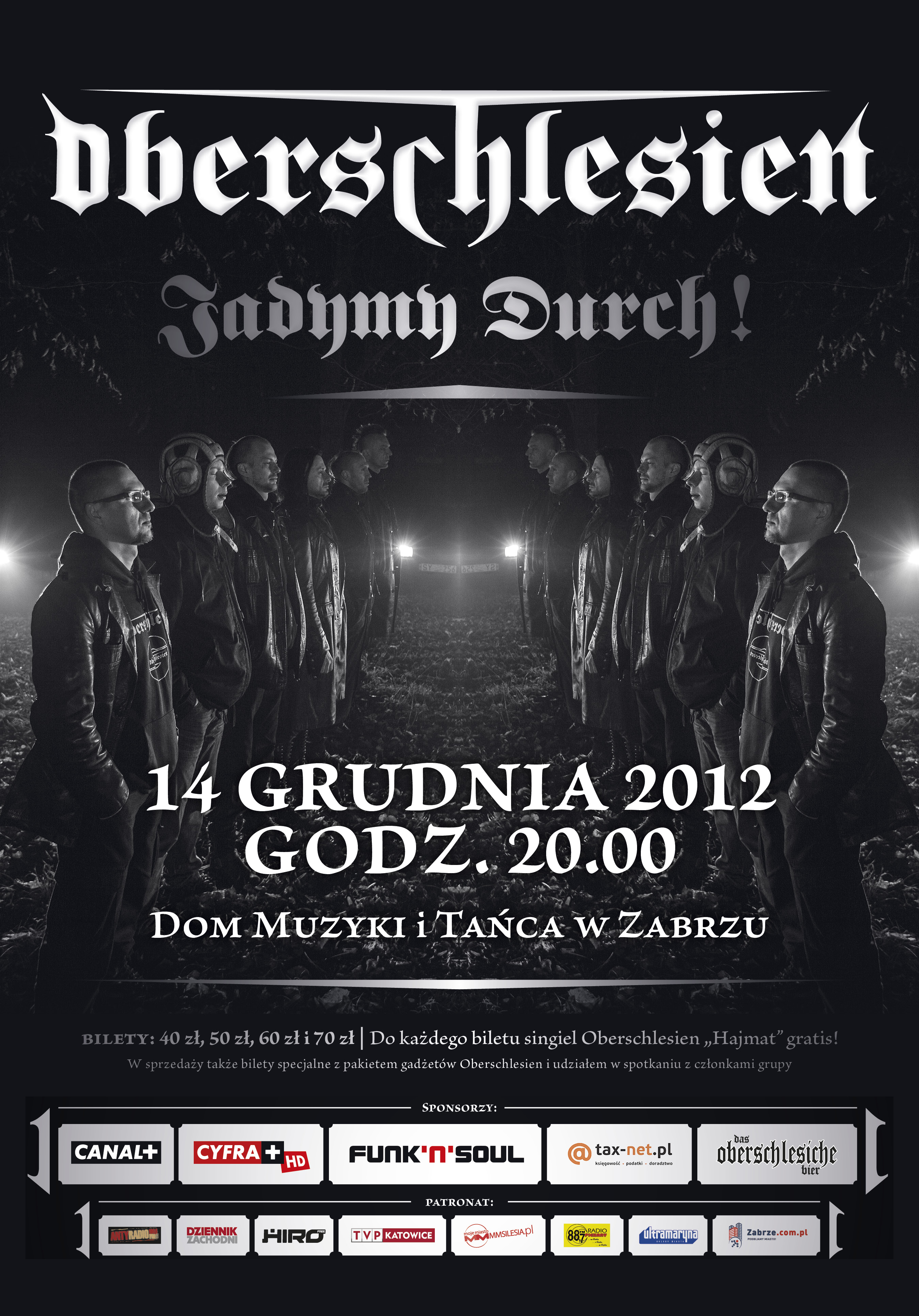 –takie motto przyświecać będzie grudniowemu koncertowi Oberschlesien. Po sukcesie w programie Must Be The Music, grupa nie spuszcza z tonu. Widowiskowy koncert zaplanowany na prestiżowej scenie Domu Muzyki i Tańca w Zabrzu, z pewnością przyciągnie i zachwyci już zdeklarowanych oraz przyszłych fanów formacji. Dzięki Oberschlesien mocny i czysty przekaz zawarty w słowach i dźwiękach, wprost z serca Górnego Śląska trafił do słuchaczy w całej Polsce. Projekt tworzy szóstka doświadczonych muzyków, którzy pragną pokazać śląską tożsamość w nowym świetle. Zainspirowani formacją Rammstein, która śpiewając po niemiecku z hukiem podbiła świat, sięgają po industrialne brzmienia z mocnymi tekstami, śpiewanymi po śląsku. Efektem są szczere, głębokie piosenki o radości życia, rozstaniach i powrotach, kobietach, motocyklach, wódzie i przede wszystkim o życiu tu – na Górnym Śląsku (członkowie grupy pochodzą z Piekar Śląskich, Bytomia i Sośnicy). O tym, jak skutecznie grupa Oberschlesien zmiata stereotyp śląskości karykaturalnej i – niestety – trywialnej, najlepiej przekonać się Na żywo, podczas ognistego show 14 grudnia w Zabrzu! Oberschlesien o sobie: „Chcemy pokazać wszystkim, a najbardziej samym sobie, że można pisać, śpiewać i myśleć po śląsku. Chcemy zrobić coś normalnego dla Ślązaka i coś ciekawego, innego dla ludzi, którzy ze Śląskiem nie mają, a być może chcieliby mieć coś wspólnego. Dla nich mamy krótkie, życiowe opowieści z mocnym słowem i potężnym brzmieniem”.