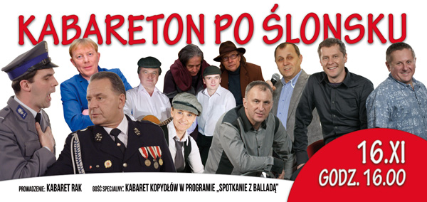 Po raz kolejny zapraszamy do Domu Muzyki i Tańca na śląski kabareton. Tym razem bawić Państwa będą: Masztalscy, Jorgusie, Grzegorz Stasiak, Mirek Szołtysek i Wesołe Trio oraz Kabaret Kopydłów w programie „Spotkania z balladą”, całość poprowadzi Kabaret Rak.