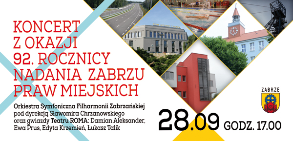 1 października 1922 roku gminie wiejskiej Hindenburg nadano prawa miejskie. Tak więc 1 października 2014 roku nasze miasto obchodzić będzie 92. urodziny! A urodziny, wiadomo –jest to okazja do spotkania się i świętowania. Na Śląsku nie może być inaczej. Zapraszamy więc Państwa na te urodziny Zabrza, które świętować będziemy w Domu Muzyki i Tańca. Uatrakcyjni nam je Orkiestra Symfoniczna Filharmonii Zabrzańskiej pod dyrekcją Sławomira Chrzanowskiego, a wraz z nią gwiazdy Teatru Roma - Damian Aleksander, Ewa Prus, Edyta Krzemień i Łukasz Talik. Gospodarzem gali będzie Beata Smaga. Wieczór zapowiada się niezwykle atrakcyjnie, ponieważ w towarzystwie wspomnianych artystów przeniesiemy się w świat musicali. Będziecie Państwo mieli okazję posłuchać największych przebojów z tego gatunku. A biorąc pod uwagę wykonawców – naszych zabrzańskich symfoników i solistów Teatru Roma – będzie to udana urodzinowa impreza. |