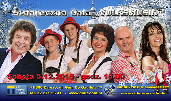 5 grudnia 2015 r. odbędzie się III ŚWIĄTECZNA GALA VOLKSMUSIK, zorganizowana dla Państwa przez Wydawnictwo Muzyczne Cider Records. Będzie to kolejna okazja, by wraz z artystami przeżyć niepowtarzalne chwile nawiązujące do klimatu świąt i znanych Państwu dobrze rytmów niemieckich szlagierów oraz Volksmusik. Tego wieczoru scena Domu Muzyki i Tańca w Zabrzu zamieni się w przepiękną zimową krainę, w której spędzą Państwo z artystami niepowtarzalne i niezapomniane chwile! Jako prowadzący wystąpi duet Die Silinger, który zaprezentuje i przedstawi Państwu swoich wykonawców, którymi są tym razem: – Tony Marshall – legenda niemieckich szlagierów, goszczący w Polsce po raz pierwszy, – Sonja Christin – zaprezentuje utwory znane, ale i nowe, szybko wdzierające się w serca publiczności; w Polsce gościła już kilkakrotnie, a jej występy cieszyły się zawsze ogromnym powodzeniem, – Selina i Loreen – wychowanki Eberharda Hertela (ojca Stefanie Hertel), które z całą pewnością podbiją Państwa serca śpiewając piosenki przywołujące lata dzieciństwa. Część pierwsza to specjalny koncert świąteczny, w którym usłyszą Państwo najpiękniejsze i bliskie sercu niemieckie piosenki adwentowe i bożonarodzeniowe. Piosenki, które wraz z piękną zimową scenerią przeniosą Państwa w inny, zaczarowany i pełen wspomnień, świat! Część druga to dobrze znane z radia i telewizji największe szlagiery w pierwszorzędnym i oryginalnym wykonaniu, m.in. „Bora, Bora”, „Schöne Maid”, „Eine Insel aus Träumen geboren” oraz inne wielkie przeboje, które przypomną Państwu lata młodości. Zespół Die Silinger przygotuje specjalnie na tę okazję piosenki ze swej najnowszej płyty. Najpiękniejsze, znane Państwu Volkslieder i Wanderlieder, usłyszymy w wykonaniu Seliny i Loreen, a będą to m.in.: „Muss I denn, muss I denn zum Städtele hinaus”, „Lustig ist das Zigeunerleben”, „In einem Polenstädtchen”, „Schneewalzer”… i wiele, wiele innych, znanych i ciepło brzmiących piosenek „z tamtych czasów”. Sonja Christin porwie Państwa w swój szlagierowy, pełen wdzięku i temperamentu program. Cały wieczór przepełniony będzie wieloma atrakcjami i niespodziankami. Serdecznie zapraszamy! |