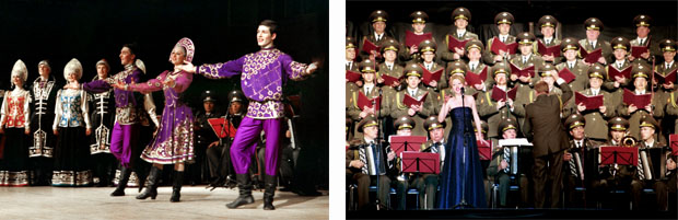 W 1929 roku chór pojechał na dawny rosyjski Daleki Wschód, aby dawać występy przed żołnierzami oddziałów wojskowych pracujących przy budowie dalekowschodniej kolei. Do swojej widowni artyści dojeżdżali ciężarówkami, wozami, a czasami zmuszeni byli iść pieszo. Niekiedy dawali nawet po kilka występów dziennie. W latach 30. zespół ciągle podróżował występując dla żołnierzy i marynarzy, a także robotników pracujących na wielkich placach budowy. W 1937 roku chór po raz pierwszy wyjechał za granicę, aby reprezentować sztukę sowiecką na Wystawie Światowej w Paryżu. Jego występy we Francji spotkały się z bardzo pozytywnym odbiorem - chór odniósł ogromny sukces, zdobywając Grand Prix wystawy. Podobnie dużym sukcesem okazała się podróż do Czechosłowacji. W 1938 roku grupa wróciła na Daleki Wschód, gdzie przez 5 miesięcy dawała występy w miastach, garnizonach oraz na... statkach wojennych floty znajdującej się na Pacyfiku. Potem chór został wysłany do żołnierzy walczących na froncie japońskim, gdzie dał wiele występów podnoszących morale wojska. Podczas II wojny światowej chór dał ponad 1500 występów na froncie i na tyłach wojsk. Artyści występowali w koszarach, zanim żołnierze szli do ataku, na lotniskach, a także w szpitalach. Do roku 1989 chór odwiedził ponad 40 krajów w Europie, Azji, Afryce oraz Ameryce. Ich występy zawsze spotykały się krajach z żywym zainteresowaniem i uwagą ze względu na wielość wpływów kulturowych.