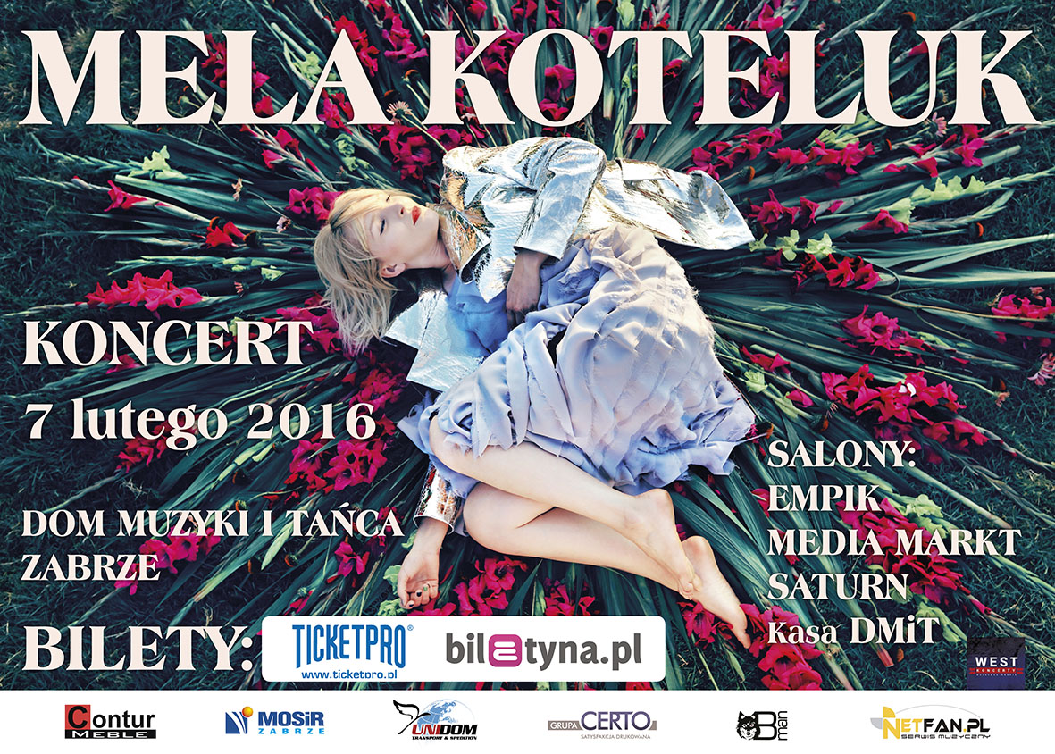Mela Koteluk zadebiutowała w 2012 roku albumem „Spadochron”, który odniósł duży komercyjny sukces i zyskał status Platynowej Płyty. Album zawiera dwanaście autorskich kompozycji, które stanowią połączenie popu i brzmień o charakterze alternatywnym. Całość tworzy historię opowiedzianą w bezpretensjonalny sposób, łączący klimat liryczno-poetycki z przestrzenią rockową. Za debiutancką płytę Mela otrzymała dwa Fryderyki 2013 w kategoriach Album Roku i Debiut Roku. W 2014 roku ukazała się druga, autorska płyta Meli pt. „Migracje”. Album promują cztery single: „Fastrygi”, „Żurawie origami” i „Tragikomedia”. Każdy z utworów bardzo szybko znalazł się na playlistach stacji radiowych, w tym w czołówce Listy Przebojów Programu 3. „Migracje” to zbiór niezależnych brzmieniowo kompozycji i polskich autorskich tekstów. Całość dowodzi konsekwencji Meli i jej zespołu w pielęgnowaniu charakterystycznego języka, którego nie sposób pomylić z żadnym innym. W warstwie brzmieniowej opiera się on na łączeniu akustycznych i syntetycznych brzmień, w warstwie słownej realizm ściera się z abstrakcją. Na płycie pojawiają się oryginalne, kojące dźwięki bardzo rzadkiego instrumentu w kształcie przypominającego UFO, o nazwie hang drum. Utwory ubarwia wiolonczela, a także flety, saksofony i klarnety. Koncerty to bardzo ważna przestrzeń dla Meli w komunikacji z fanami. Zdążyła już wystąpić zarówno w wielu klubach w całej Polsce, jak i na prestiżowych festiwalach: Open’er Festival, Coke Festival, Jarocin Festival czy Spring Break. W tym roku Mela dołączyła do składu Męskie Granie Orkiestra i zagrała na wszystkich odsłonach tej letniej trasy. Ostatnio Mela wystąpiła gościnnie na płycie Daniela Blooma, wykonując piosenkę „Katarakta”, która stała się singlem promującym ten album. |