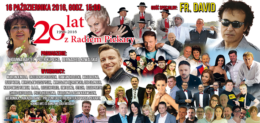 WYJĄTKOWY KONCERT, WYJĄTKOWI ARTYŚCI, GWARANCJA UDANEJ ZABAWY! To będzie wyjątkowy koncert, bo zarówno okazja, jak i Artyści są wyjątkowi. Swoje 20 urodziny świętuje Radio Piekary – od lat najpopularniejsza śląska rozgłośnia radiowa. Z tej okazji serdecznie zapraszamy Państwa na jubileuszowy koncert galowy – ’20 lat z Radiem Piekary’, w którym udział wezmą największe gwiazdy muzyki rozrywkowej, sceny śląskiej i biesiadnej oraz gość specjalny – cieszący się międzynarodową sławą i karierą wokalista, twórca ponadczasowego hitu – ‘Words (don’t come easy)’ – FR David! Nie ma osoby na tym świecie, która nie zna tego utworu – na koncercie będziecie mieli Państwo możliwość usłyszenia go w wersji live! Skład imprezy jest naprawdę imponujący – w koncercie, oprócz gościa specjalnego, udział wezmą: Prezenterzy i Redaktorzy Radia Piekary, Marcin Kindla, Grzegorz Poloczek, Damian Holecki, Magdalena, Duet Karo, Mirosław Szołtysek, Mirosław Jędrowski, Die Silinger, Karpowicz Family, B.A.R. , Leszek Filec, EMI Band, Stach, Chris Oxforduo, Piotr Herdzina, Weronika, Karolina i Adam Krawczyk oraz Arkadia Band. Artystom towarzyszyć będą: Dance Art., Wesoła Biesiada oraz zespół muzyczny Es Band. Koncert poprowadzą: Joanna Bartel, Piotr Kupicha i Bernadeta Kowalska. Usłyszycie Państwo największe przeboje Artystów, emitowane od 20 lat na antenie Radia Piekary, zatem bardzo dobrze Wam znane – idealne do wspólnego pośpiewania! Gwarantujemy Państwu rozrywkę na najwyższym poziomie i wiele wspaniałych, muzycznych i nie tylko, wrażeń! Po występach polskich Artystów nadejdzie czas na recital gwiazdy wieczoru – FR David’a. Pochodzący z Francji wokalista jest najbardziej znany z przeboju ‘Words (don’t come easy)’, wydanego w 1982 roku, który sprzedał się w ilości ośmiu milionów kopi, podbił listy przebojów w całej Europie, zdobywając m.in. drugie miejsce na liście przebojów UK Singles Chart w Wielkiej Brytanii. FR David współpracował również m.in. z Vangelisem oraz z francuskim zespołem rockowym Les Variations. Jest również kompozytorem utworów dla wielu innych, znanych artystów. Jego dyskografia liczy osiem płyt długogrających i 13 singli. Koncert ’20 lat z Radiem Piekary’ będzie rejestrowany i ukaże się w formacie DVD tuż przed Świętami Bożego Narodzenia – będzie to zatem idealny prezent pod choinkę dla Państwa bliskich i możliwość ‘przeżycia tego jeszcze raz’! Podczas koncertu premierę będą miały również dwie długo oczekiwane płyty – kolejna płyta Damiana Holeckiego oraz debiutancka solowa płyta Magdaleny Pal! Płyty będą do nabycia na koncercie. SERDECZNIE ZAPRASZAMY! |