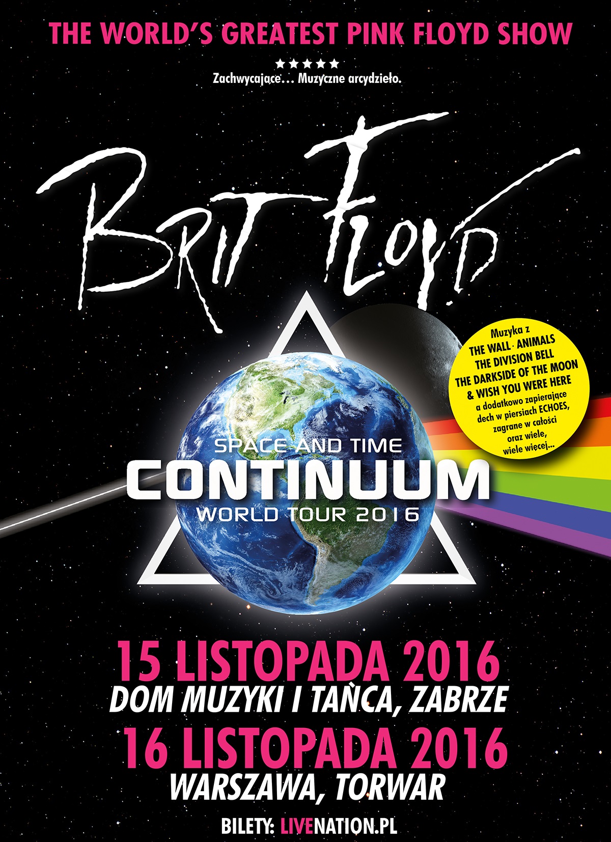 Rozpoczęcie koncertu zgodnie z informacją umieszczoną na biletach. Space and Time CONTINUUMŚWIATOWA TRASA 2016 Po ciepło przyjętym ogłoszeniu koncertu na warszawskim Torwarze z radością informujemy, że Brit Floyd po raz pierwszy odwiedzi Zabrze! Najsłynniejsze utwory Pink Floyd już 15 listopada w Domu Muzyki i Tańca. Po wielkim sukcesie trasy z 2015 roku, która objęła aż 146 koncertów na całym świecie, Brit Floyd, The World’s Greatest Pink Floyd Show, powraca do Europy w 2016 roku, aby kontynuować tę wspaniałą podróż przez 50 lat twórczości Pink Floyd. Oprócz ulubionych utworów z The Dark Side of the Moon, Wish You Were Here, Animals, The Wall czy The Division Bell nie zabraknie również innych, mniej znanych kawałków z bogatego katalogu klasyków rocka. Brit Floyd uraczy publiczność zapierającym dech w piersiach, odegranym w całości utworem Echoes, pochodzącym z albumu Meddle. Nie zabraknie również innych muzycznych perełek z repertuaru Pink Floyd! Po ubiegłorocznym sukcesie "Space and Time Tour" Damian Darlington – wokalista, gitarzysta i muzyczny dyrektor Brit Floyd powiedział: "Reakcja publiczności była tak fenomenalna, że zdecydowaliśmy się kontynuować ją w 2016 roku jako Space and Time CONTINUUM. Przygotowaliśmy jeszcze ciekawsze show, które chcemy pokazać wszystkim. Jest tak bardzo dużo dobrych utworów w całym dorobku Pink Floyd i zdecydowanie będziemy się starali dodać kilka nowych utworów, nie zapominając jednocześnie o ulubionych utworach publiczności”. Brit Floyd – Space and Time CONTINUUM to spektakularny pokaz światła i projekcji wizualnych o wartości miliona dolarów. To również obietnica najbardziej ambitnego i najlepszego z koncertów zespołu, jakie powstały do tej pory. ‘Idealne rockowe show’ - LA Times 'Wspaniałe… Muzyczne arcydzieło’ – Ticketmaster www.britfloyd.com |