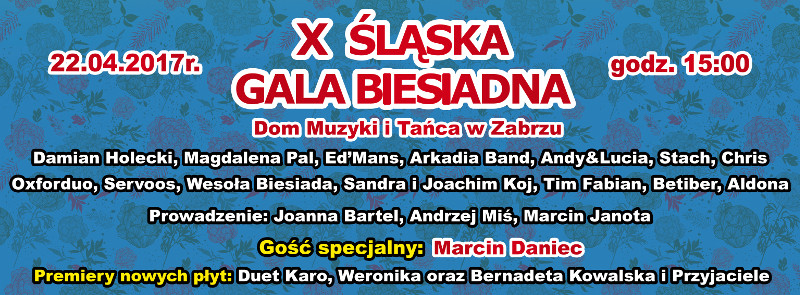 Zapraszamy na kolejną – JUBILEUSZOWĄ – edycję koncertu Śląska Gala Biesiadna. Najbardziej prestiżowa impreza w tym gatunku muzycznym obchodzić będzie swoje 10. Urodziny! Koncert odbędzie się 22 kwietnia 2017 r. jak zawsze w Domu Muzyki i Tańca w Zabrzu. X Śląska Gala Biesiadna z racji swojego jubileuszu będzie inna niż wszystkie! Organizatorzy postanowili zaskoczyć publiczność, która przybędzie na tegoroczne widowisko. Czy tym razem również zabraknie biletów na kilka miesięcy przed koncertem? W roli prowadzących zobaczymy najweselszą śląską artystkę – Joannę Bartel, najpopularniejszego śląskiego radiowca i konferansjera – Andrzeja Misia oraz ulubionego, przez fanów muzyki śląskiej, prezentera telewizyjnego i radiowego – Marcina Janotę. Gwiazdą jubileuszowej X Śląskiej Gali Biesiadnej będzie jedna z najbardziej rozpoznawalnych postaci w świecie rozrywki, najpopularniejszy satyryk w historii polskiego kabaretu – Marcin Daniec. Podczas X Śląskiej Gali Biesiadnej premiery swoich płyt świętować będą Bernadeta Kowalska, Duet Karo oraz Weronika. Na scenie pojawią się także ulubieńcy: Damian Holecki, Magdalena Pal, Ed’Mans, Stach, Chris Oxforduo, Servoos, Wesoła Biesiada, Arkadia Band, Sandra i Joachim Koj, Andy & Lucia, Tim Fabian, Betiber, Aldona. Gwarantujemy doskonałą rozrywkę, najlepszych wykonawców i najwyższa jakość – X Śląska Gala Biesiadna 2017. |