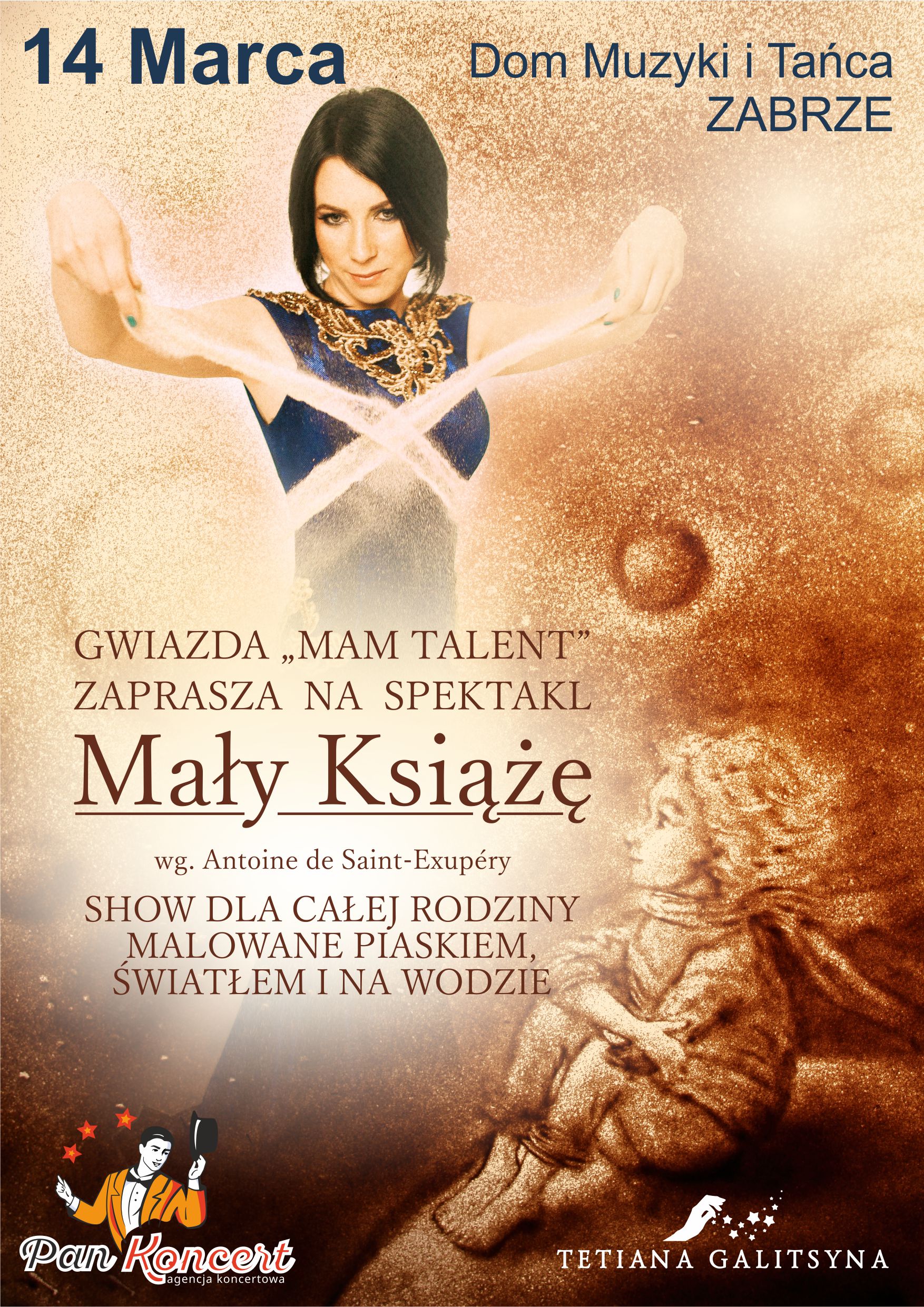 „MAŁY KSIĄŻĘ” – SPEKTAKL OPOWIEDZIANY PIASKIEM, WODĄ I ŚWIATŁEM W WYKONANIU GWIAZDY PROGRAMU „MAM TALENT” – TETIANY GALITSYNY JUŻ NIEBAWEM W POLSCE! „Mały książę” to wyjątkowa opowieść dla całej rodziny, która więcej mówi o życiu, niż grube, uczone księgi. Agencja koncertowa “PanKoncert” i “Galitsyna Art Group” przedstawiają! Zwyciężczyni programu „Mam Talent" Tetiana Galitsyna wraz z najszybszym malarzem na świecie VLODYRem i grupą artystów, przygotowywała unikalne widowisko – historię Małego Księcia wg. Antoine de Saint-Exupéry'ego, tworzoną na oczach widzów piaskiem, połączoną ze animacją światłem, wodą oraz elementami spektaklu teatralnego i technik szybkiego malowania (tzw.speed painting). Dopełnieniem niezapomnianego show jest przepiękna oprawa muzyczna, poruszająca najgłębsze emocje i przenosząca odbiorców na magiczną planetę Małego Księcia. „Mały Książę” (wg. Antoine de Saint-Exupéry'ego) to cudowna, pełna poezji i mądrych refleksji opowieść o przyjaźni, miłości i życiu. Przetłumaczona na 160 języków historia chłopca, który swobodnie przekracza granice między światem realnym a sferą niezwykłości. Mały Książę przypomina o tym, że „ wszyscy dorośli byli kiedyś dziećmi, tyle, że tylko nieliczni z nich jeszcze o tym pamiętają...” Zapraszamy Państwa do magicznej krainy dzieciństwa, by zobaczyć świat na nowo wrażliwymi oczami kilkuletniego bohatera. Przed nami niesamowite show w wykonaniu gwiazdy „Mam Talent” – Tetiany Galitsyny. Poruszająca opowieść o Małym Księciu opowiedziana światłem i wodą, malowana na żywo piaskiem, połączona z elementalmi spektaklu teatralnego. Dopełnieniem niezapomnianego show jest przepiękna, poruszająca najgłębsze emocje oprawa muzyczna. „[...] dobrze widzi się tylko sercem [...]” – zapraszamy na niespotykaną dotychczas interpretację kochanego przez wszystkie dzieci i dorosłych Małego Księcia. To niezwykły 70-minutowy spektakl, który przeniesie Państwa na magiczną planetę Małego Księcia. |
