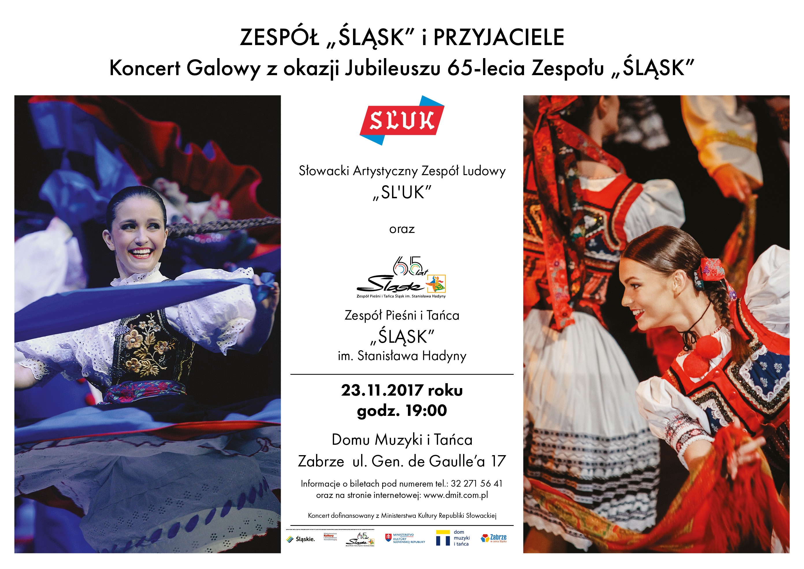 Zespół „Śląsk” i Przyjaciele to wyjątkowy koncert, na który zapraszamy 23 listopada o godz. 19.00 do Domu Muzyki i Tańca. Będzie to wielkie wydarzenie artystyczne, zorganizowane w ramach jubileuszu 65-lecia Zespołu „Śląsk”. Na zabrzańskiej scenie spotkają się dwa folklorystyczne żywioły - obok Zespołu „Śląsk” wystąpi Słowacki Artystyczny Zespół Ludowy „SLUK”. Współpraca obu zespołów to efekt wieloletniej przyjaźni, przekładającej się na wspólne przedsięwzięcia artystyczne. Słowacki „SLUK” powstał w 1949 r. i z powodzeniem łączy tradycję z nowoczesnością. Inspirując się autentycznym folklorem słowiańskim, tworzy widowiska na najwyższym poziomie. Obchodzący swój jubileusz Zespół „Śląsk” im. Stanisława Hadyny to instytucja kultury o ogromnych możliwościach wykonawczych realizująca ok. 120 koncertów rocznie. Repertuar zespołu to wielka skarbnica polskiej kultury. „Śląsk” wystąpił ponad 8 tysięcy razy dla ponad 25 milionów widzów w 44 krajach na pięciu kontynentach. |