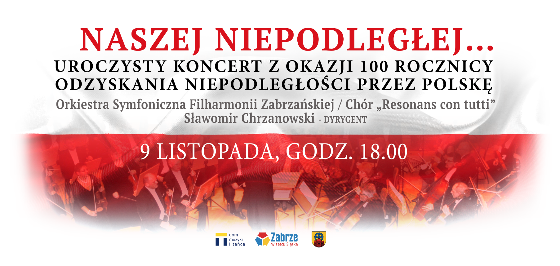 Stulecie odzyskania niepodległości przez Polskę to bardzo ważna rocznica dla wszystkich Polaków. W całym kraju odbywają się z tej okazji koncerty, konferencje, wystawy… W Zabrzu również doceniamy powagę tego historycznego wydarzenia i właśnie dlatego w Domu Muzyki i Tańca odbędzie się uroczysty koncert, na który serdecznie zapraszamy. Wystąpi przed Państwem Orkiestra Symfoniczna Filharmonii Zabrzańskiej pod dyrekcją Sławomira Chrzanowskiego oraz chór Resonans con tutti przygotowany przez Arlenę i Waldemara Gałązków. W programie koncertu znajdą się utwory Wojciecha Kilara – Exodus, Angelus, Victoria.