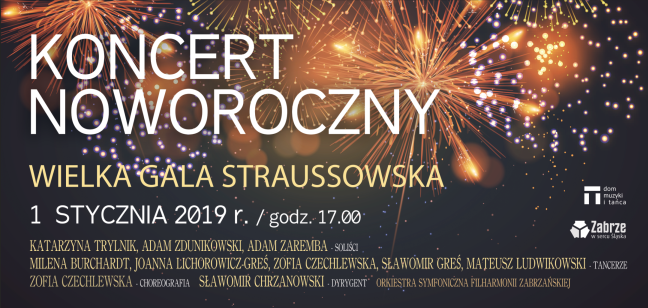 Tradycyjnie już kolejny rok rozpoczynamy Koncertem Noworocznym w wykonaniu Orkiestry Symfonicznej Filharmonii Zabrzańskiej pod dyrekcją Sławomira Chrzanowskiego. Filharmonikom towarzyszyć będą soliści: Katarzyna Trylnik, Adam Zdunikowski i Adam Zaremba oraz tancerze: Milena Burchardt, Joanna Lichorowicz-Greś, Zofia Czechlewska, Sławomir Greś i Mateusz Ludwikowski. Autorką choreografii i kostiumów jest Zofia Czechlewska. Tematem koncertu będzie Wielka Gala Straussowska. Usłyszycie więc Państwo największe przeboje znad pięknego, modrego Dunaju. Zapraszamy.