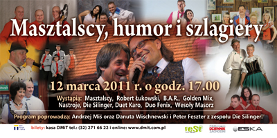 To już 25 lat minęło jak Masztalscy pojawili się na estradach w kraju i zagranicą. Przez ten czas nieustannie bawili publiczność przedstawiając skecze, głównie w gwarze śląskiej. Znamy ich również m.in. z takich programów rozrywkowych jak „Lato z Radiem”, „Cztery pory roku”, „Sygnały dnia”. To Srebrne Wesele Masztalskich będzie „okraszone” humorem i szlagierami zaproszonych artystów. Wystąpią: Robert Łukowski, B.A.R., Golden Mix, Nastroje, Die Silinger, Duet Karo, Duo Fenix, Wesoły Masorz. Program poprowadzą Andrzej Miś znany prezenter Radia Piekary oraz Danuta Wischnewski i Peter Feszter z zespołu Die Silinger. Przyjdź i pobaw się z nami!