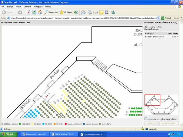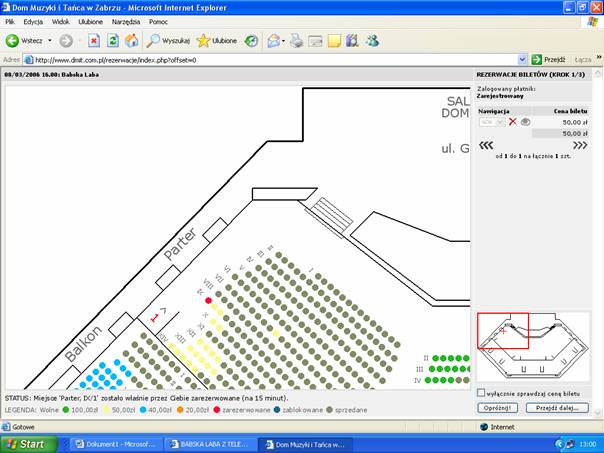 Wyboru biletu dokonujemy poprzez wskazanie myszką na planie widowni wolnego miejsca i naciśnięcie lewego przycisku myszy. Po tej operacji wybrane miejsce zmieni kolor na czerwony a na liście pojawi się wybrany bilet. Operacja ta może trwać kilkadziesiąt sekund w zależności od obciążenia systemu. Następnie możemy zaznaczać kolejne bilety, które będą pojawiały się na ekranie i na liście. Lista obejmuje tylko pięć pozycji, następne dostępne są po wybraniu strzałki pod listą. Pod listą znajduje się także podsumowanie liczby i wartości wybranych biletów.