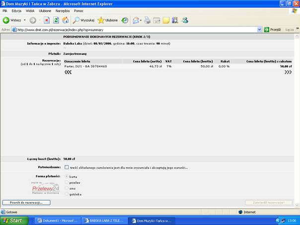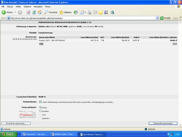 Od tej chwili w ciągu 15 minut należy dokończyć zakupu biletów. Po wybraniu wszystkich biletów można przejść do ekranu podsumowania transakcji i wyboru formy płatności (Przycisk „Przejdź dalej”). Można także zrezygnować z operacji (przycisk „Opróźnij”). Jeśli chcemy zrezygnować z pojedynczego miejsca można skasować go z listy biletów naciskając ikonę z krzyżykiem.