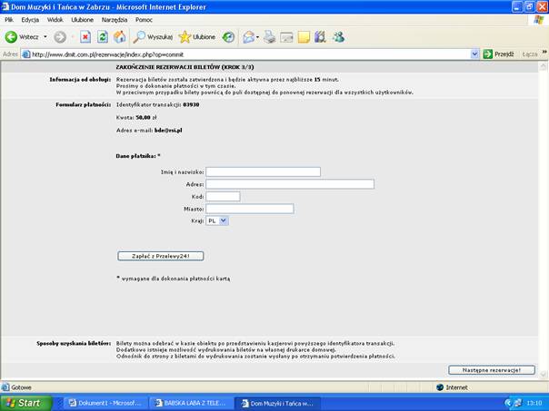 Na powyższym ekranie należy wypełnić pola wymagane dla płatności kartą, a następnie przejść do ekranu systemu płatności Przelewy24.