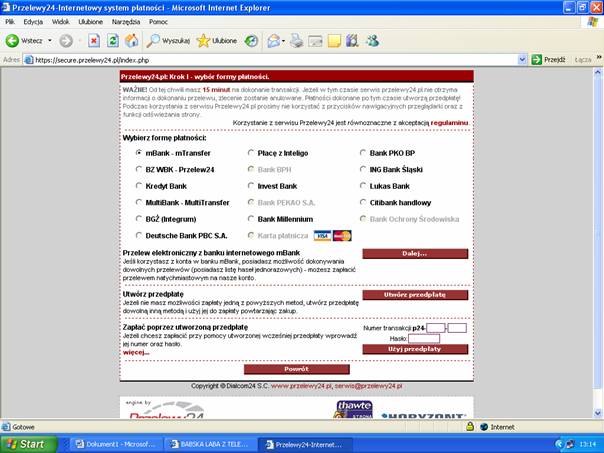 Na powyższej stronie należy wybrać formę płatności. Opcje aktywne oznaczają formy płatności dostępne w danej chwili w systemie.