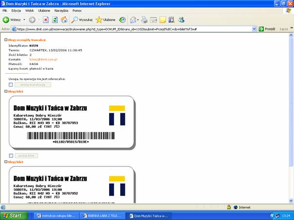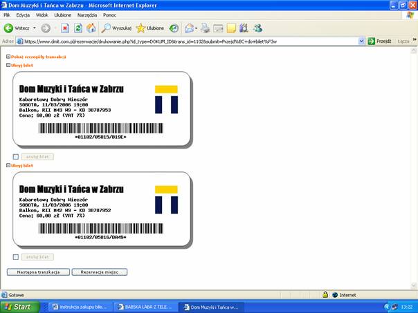 Po dokonaniu płatności system ponownie wróci do strony zakupu biletów i wyświetli formularze biletów. Bilety te należy wydrukować ze strony przeglądarki.
